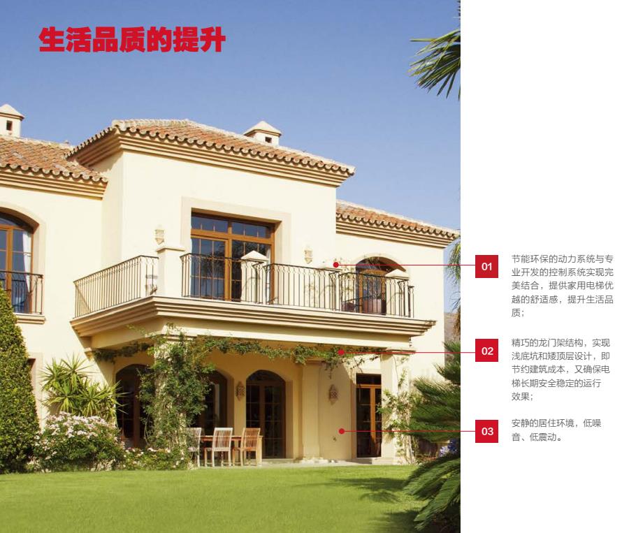 1. 节能环保的动力系统与专业开发的控制系统实现完美结合,提供家用电梯优越的舒适感,提升生活品质;