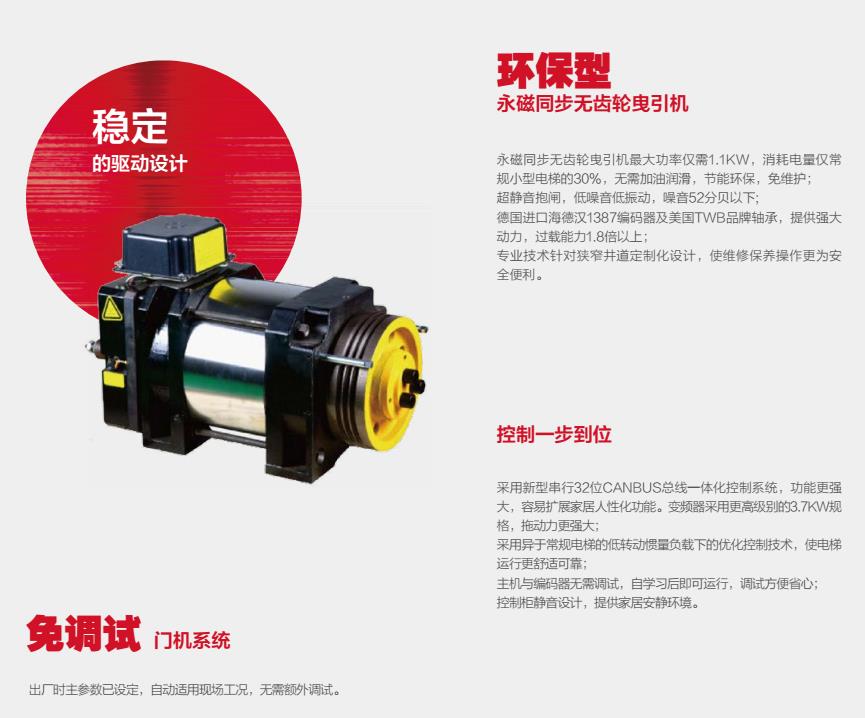 3. 精巧的龙门架结构,实现浅底坑和矮顶层设计,即节约建筑成本,又确保电梯长期安全稳定的运行效果; 环保型--永磁同步