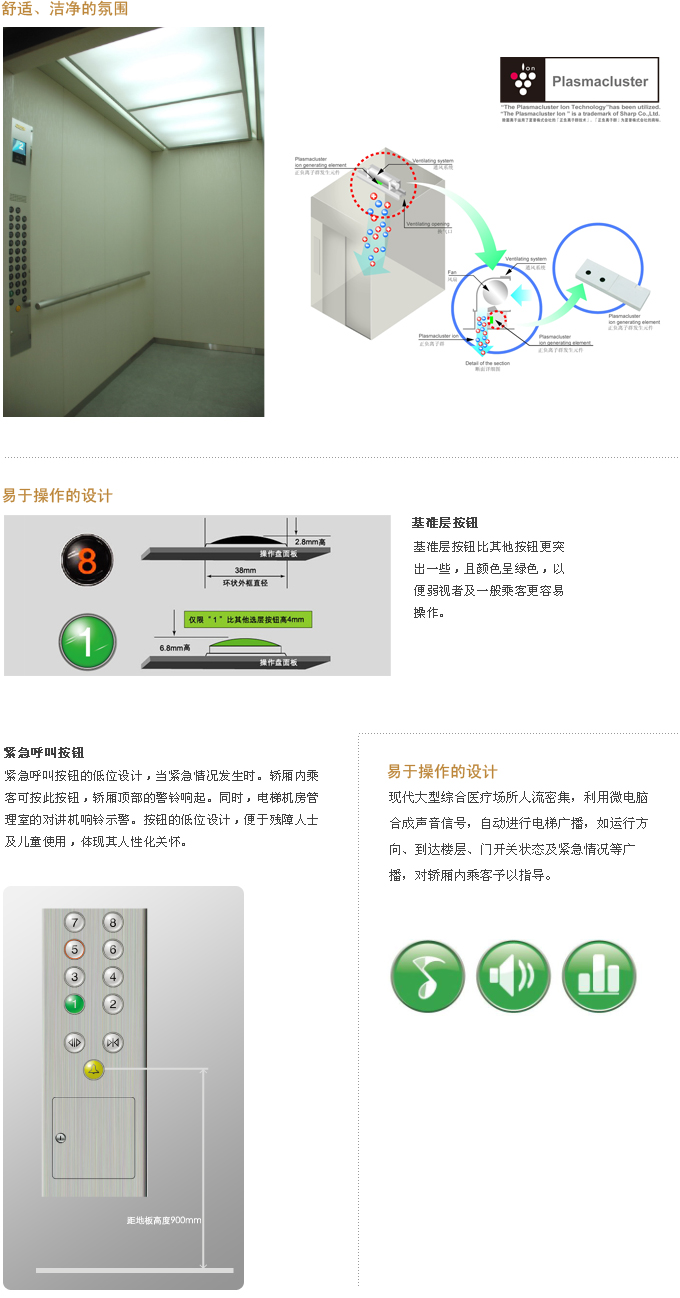 现代大型综合医疗场所人流密集,富士达医用电梯秉承节能环保理念,针对医疗场所的特点性,将安全、卫生作为重要考虑因素,并在电梯行业首创配备了轿内空气净化系统——净离子空气净化装置IONFUL,以源于创新的技术、细致的服务、关爱的构想来支持、完善医疗体系建设,共同构建更为健康、绿色的人性化移动空间。